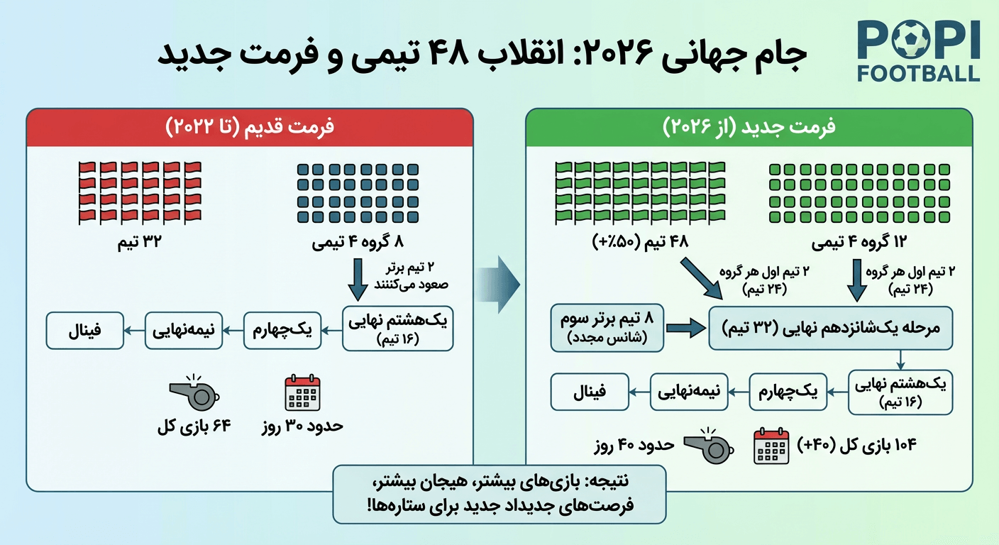 | تعداد تیمها | ۳۲ تیم | ۴۸ تیم (۵۰٪ افزایش!) |